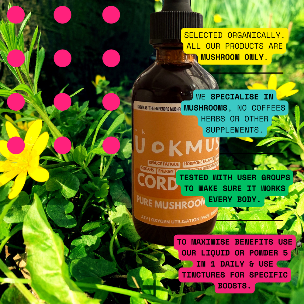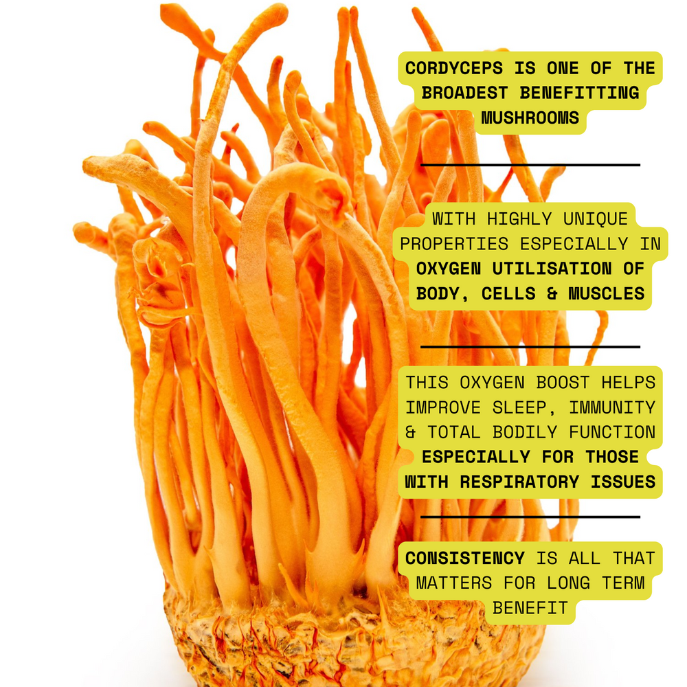 Cordyceps contains cordycepin & adenosine, compounds that help increase ATP production and improve oxygen uptake at the cellular level. These effects support endurance, physical performance, and recovery without stimulation. It also provides immune-modulating beta-glucans and antioxidant enzymes, making it distinct for promoting natural energy, respiratory function, and cellular metabolism.
