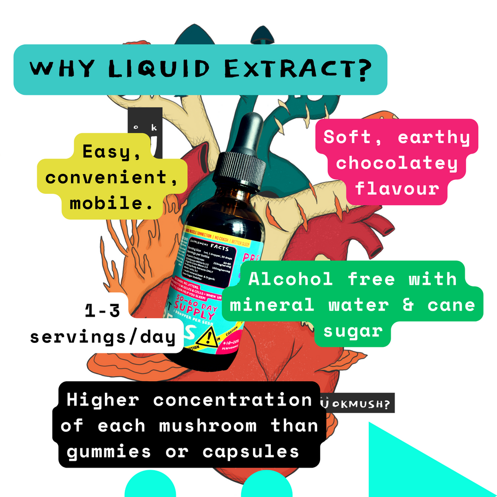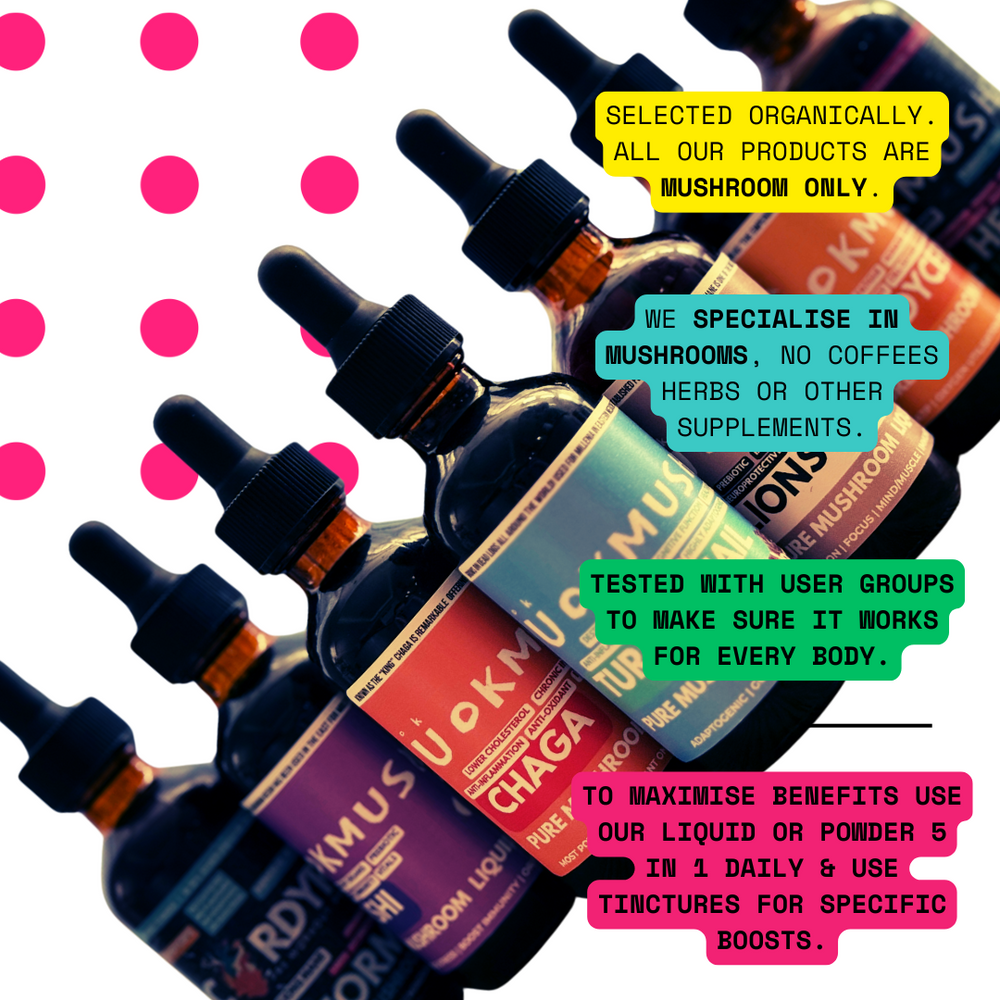 Functional mushrooms provide compounds not commonly found in other foods, including beta-glucans, ergosterol, and triterpenes, which support immunity, stress adaptation, and vitamin D metabolism. This 5-mushroom blend combines unique benefits from each species: Chaga (melanin, antioxidants), Cordyceps (cordycepin, ATP support), Reishi (ganoderic acids, immune modulation), Lion’s Mane (hericenones, NGF stimulation), and Turkey Tail (PSK, PSP, immune cell activation). These fungi deliver targeted support for energy, cognition, and immune regulation through compounds specific to mushrooms.