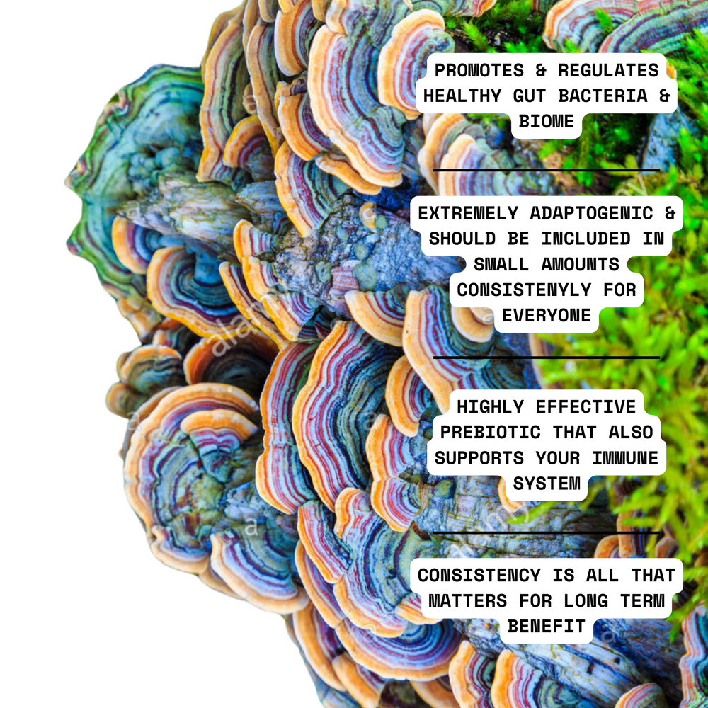 Why Turkey Tail? It’s one of the most highly unique medicinal, adaptive mushrooms in the functional world for serious issues & often chronic inflammation. Known for its unique bioactive profile, Turkey Tail supports gut health, boosts immunity & helps the body fight off nasties.